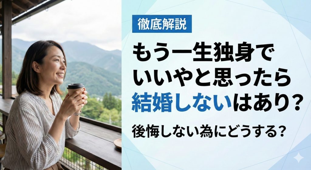 「もう一生独身でいいや」そう思ったことはありませんか? 恋愛や婚活がうまくいかない時、仕事や趣味に没頭している時など、ふとした瞬間に、そう感じてしまうかもしれません。 しかし、独身でいいやと思ったら、独身でずっといることが本当に後悔しない... 婚活全般