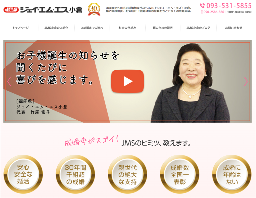 ジェイ・エム・エス小倉は、福岡県北九州市小倉北区にある創業31年の老舗結婚相談所です。全国結婚相談チェーン「ジェイ・エム・エス」の一員として、地域密着型のサービスを提供し、これまでに1,500組以上の成婚実績を誇ります。小倉駅から徒歩5分の好立地にサロンを構え、地元・小倉での結婚を希望する方々に親身なサポートを行っています。