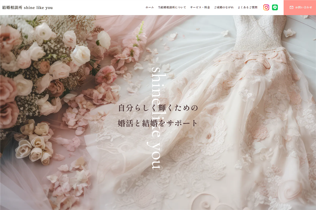 「shine like you」は、福岡県北九州市小倉北区に拠点を置く結婚相談所です。日本結婚相談所連盟(IBJ)に加盟し、経験豊富なカウンセラーが会員一人ひとりの魅力を引き出し、理想のパートナー探しをサポートします。小倉エリアで真剣に結婚を考える方に、地域密着型の丁寧なサービスを提供しています。