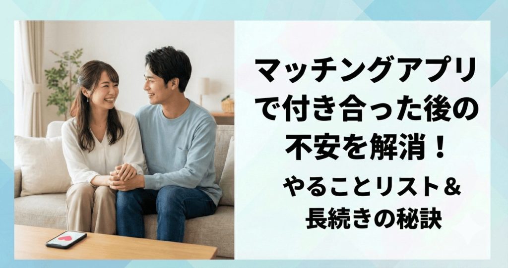 マッチングアプリで素敵な人と出会い、ついに交際スタート!嬉しい気持ちでいっぱいな一方、「これからどうすればいいんだろう?」「この関係、うまくいくかな…」といった漠然とした不安を感じていませんか? アプリでの出会いが初めてだと、付き合ったあ... -