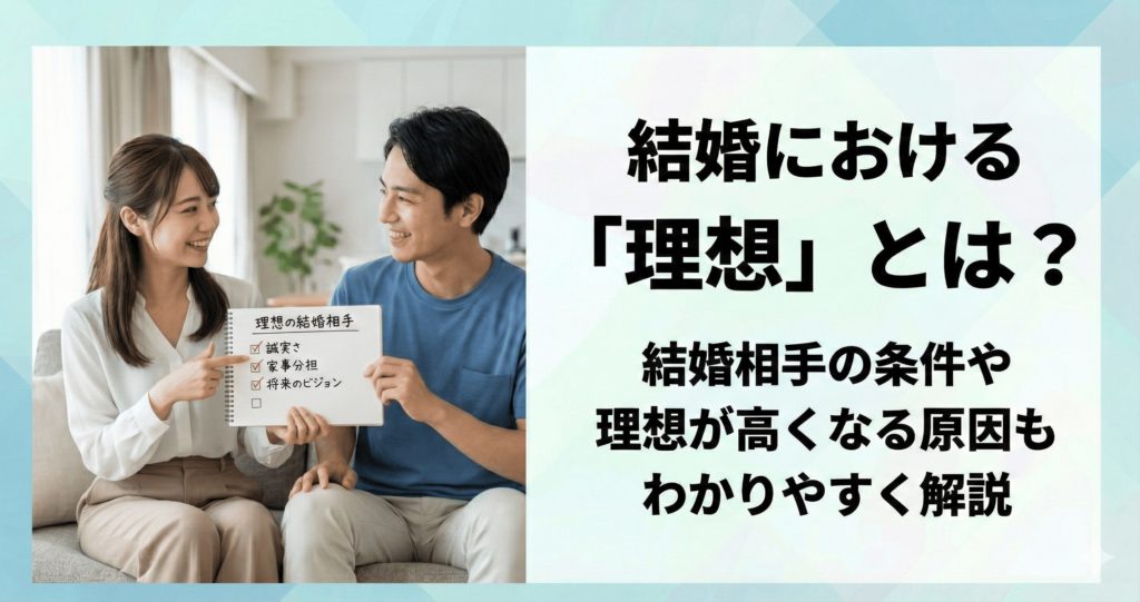「理想が高すぎて結婚できないのでは」「自分に合う条件がわからない」と悩む方は多いです。 幸せな結婚を叶えるには、理想の正体を知り、現実的な基準へ整理することが大切になります。 本記事では、多くの人が抱く理想の結婚像や相手に求める条件、理想... -