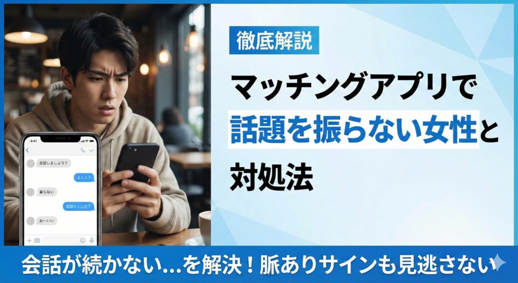 「マッチングアプリでマッチングしたのに、女性から全然話題を振ってくれない…」「いつも自分ばかり質問していて、会話が続かない…」 マッチングアプリを使っていて、こんな悩みを抱えていませんか? 一生懸命メッセージを送っても、相手の反応が薄いと「... -