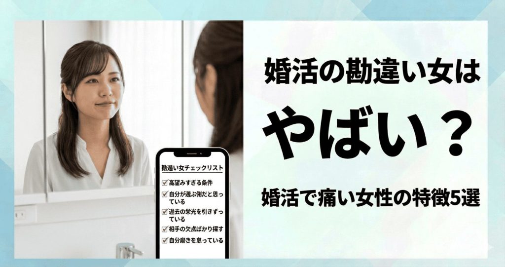 婚活パーティーやマッチングアプリで手応えがなく「自分は勘違い女と思われていないか」と不安になる女性は多いです。 また「まともな男性がいない」と悩む一方で、自身の市場価値を見誤っている可能性に気づけないケースも目立ちます。 結論として、婚活... -