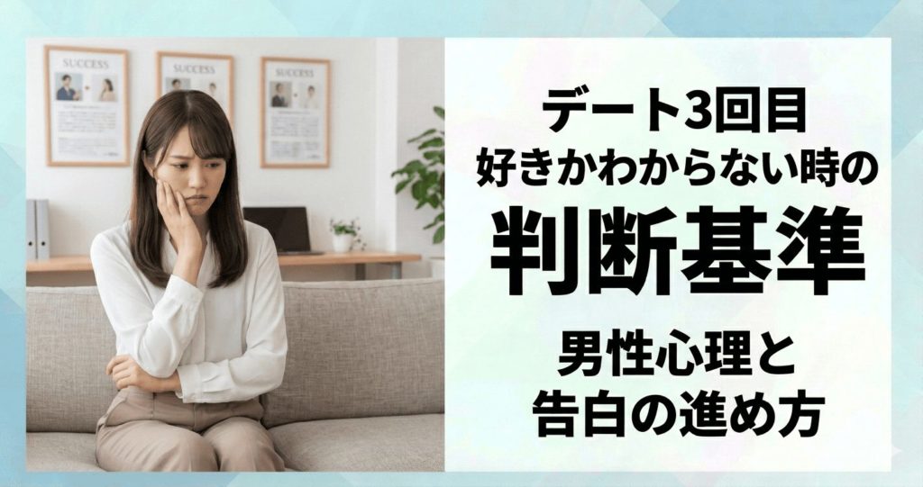 マッチングアプリや婚活で出会い、3回目のデートを迎える頃、多くの人が「相手のことは嫌いじゃないけれど、付き合いたいほど好きかわからない」という悩みに直面します。 世間一般では「3回目のデートで告白」が定説とされているため、自分の気持ちが追い... -